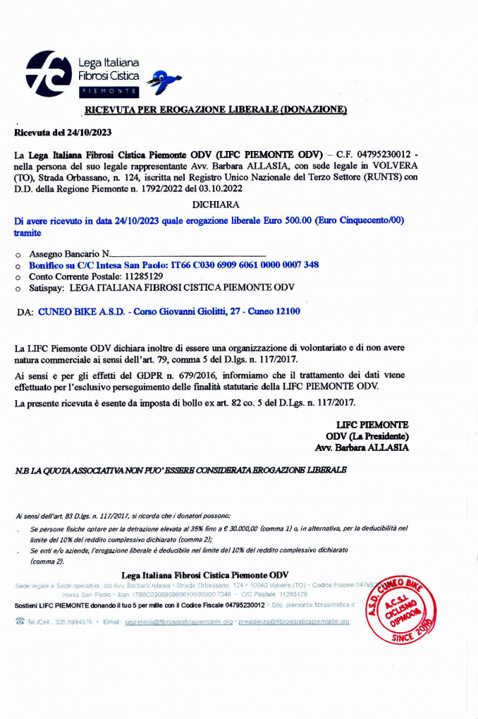 Donaz. liber. di 500,00 €. a favore della L.I.F.C. odv